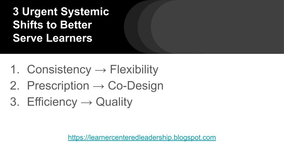 Part of my urgency comes from being a dad to two children who are in school now. It also comes from my understanding of how challenging it is to make systemic shifts in schools and in school systems. These changes require adjustments in mindsets, skillsets, and toolsets. They require us as leaders to change our habits, practices, and routines. Because these are not quick fixes, if we are serious about better serving all learners, here are three systemic shifts that leaders need to embrace now: