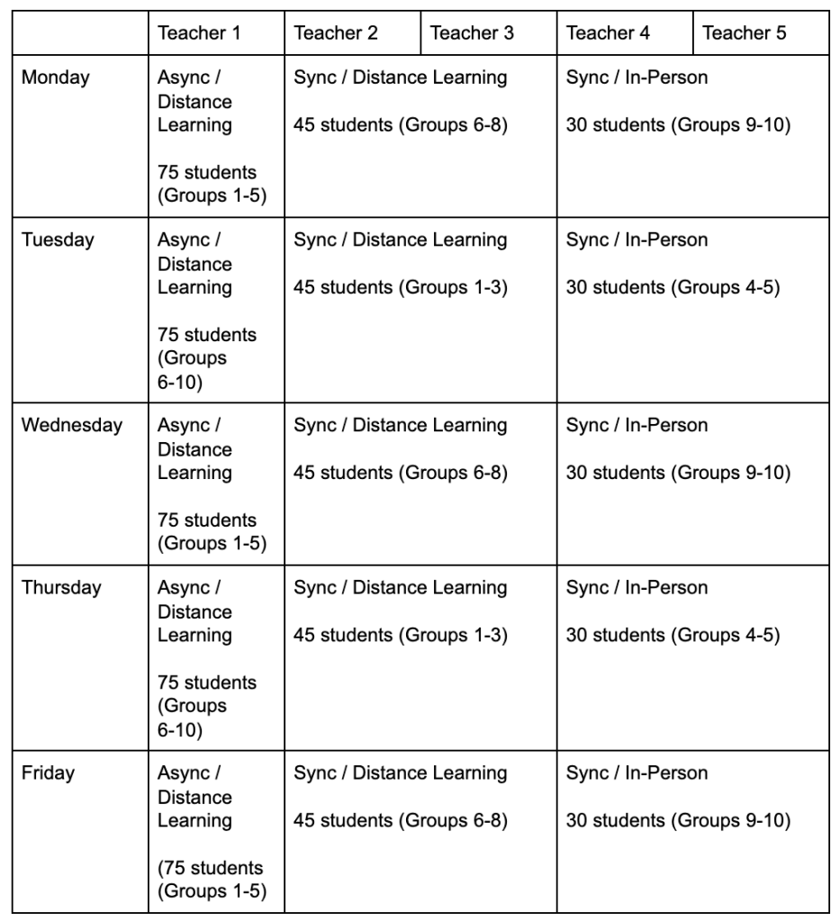 Thinking creatively about existing staffing is required. These examples are designed to be illustrative and to inspire further contextualization and adaptation. If we are asking our students and families to adapt and to be flexible, we must do the same. Connecting our desired learning outcomes with sync/async options and modularizing teams of teachers is the best way that I can imagine expanding our options at this time.