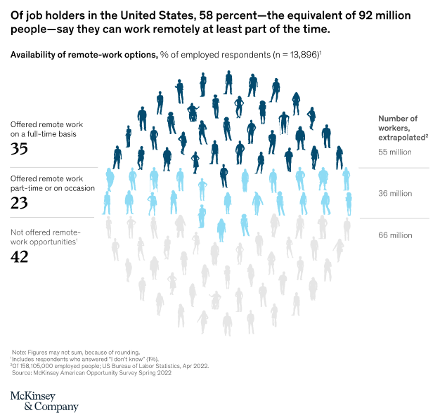 McKinsey surveyed more than 25,000 working adults in Spring 2022 and found that a staggering 58% of Americans work at least one day per week from home and 35% now have the option to work from home full-time. According to their research, “What makes these numbers particularly notable is that respondents work in all kinds of jobs, in every part of the country and sector of the economy, including traditionally labeled ‘blue collar’ jobs that might be expected to demand on-site labor as well as ‘white collar’ professions.”
